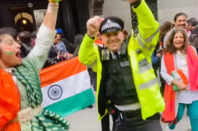 #WATCH | British policeman dances with Indian supporters outside the Indian High Commission in London.