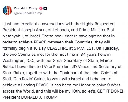 ट्रंप ने पीएम नेतन्याहू और राष्ट्रपति जोसेफ औन को व्हाइट हाउस आने का न्योता भी दे दिया है. साल 1983 के बाद यह पहला मौका होगा जब दोनों देशों के शीर्ष नेता एक मेज पर बैठकर शांति की सार्थक चर्चा करेंगे. लेबनानी राष्ट्रपति जोसेफ औन ने भी सोशल मीडिया प्लेटफॉर्म एक्स पर ट्रंप को इस पहल के लिए धन्यवाद दिया है.