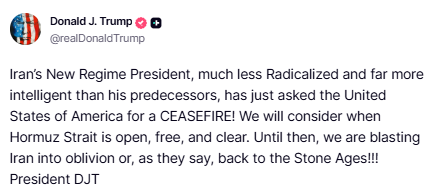ट्रंप ने अपने सोशल मीडिया प्लेटफॉर्म ‘ट्रुथ सोशल’ पर लिखा कि ईरान के नए शासन के राष्ट्रपति ने उनसे संपर्क किया है, जिसे वह पूर्ववर्तियों की तुलना में ‘बहुत कम कट्टरपंथी और कहीं अधिक बुद्धिमान’ मानते हैं. ट्रंप ने दावा किया कि उन्होंने अमेरिका से सीजफायर करने के लिए कहा है. जिस पर ट्रंप ने साफ कर दिया कि जब तक होर्मुज स्ट्रेट को ग्लोबल शिपिंग के लिए पूरी तरह से नहीं खोला जाता, तब तक अमेरिका किसी भी सीजफायर पर विचार नहीं करेगा.