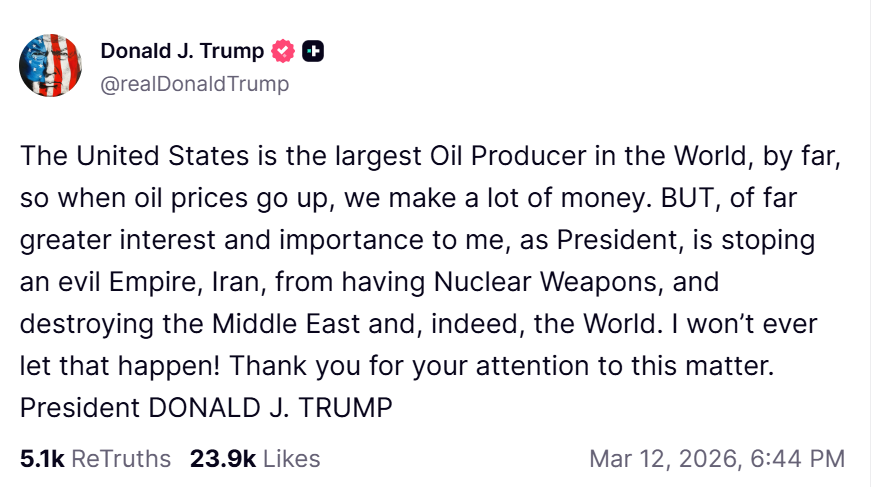 ट्रंप ने सोशल मीडिया प्लेटफॉर्म ‘ट्रुथ सोशल’ पर पोस्ट करते हुए लिखा, “अमेरिका आज दुनिया का सबसे बड़ा तेल उत्पादक देश है. इसलिए, जब भी अंतरराष्ट्रीय बाजार में तेल की कीमतें बढ़ती हैं, हम (अमेरिका) बहुत पैसा कमाते हैं, एक राष्ट्रपति के तौर पर उनके लिए पैसे से ज्यादा महत्वपूर्ण ईरान को परमाणु हथियार बनाने से रोकना है. ट्रंप ने चेतावनी दी कि अगर ईरान परमाणु शक्ति संपन्न हो गया, तो वह न केवल मिडिल ईस्ट बल्कि पूरी दुनिया को तबाह कर सकता है. उन्होंने संकल्प दोहराया, “मैं ऐसा कभी नहीं होने दूंगा.”