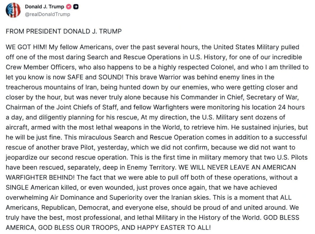 राष्ट्रपति डोनाल्ड ट्रंप ने 'WE GOT HIM!' कहते हुए मिशन की सफलता की घोषणा की और बताया कि यह 24 घंटों में दूसरा सफल रेस्क्यू था.