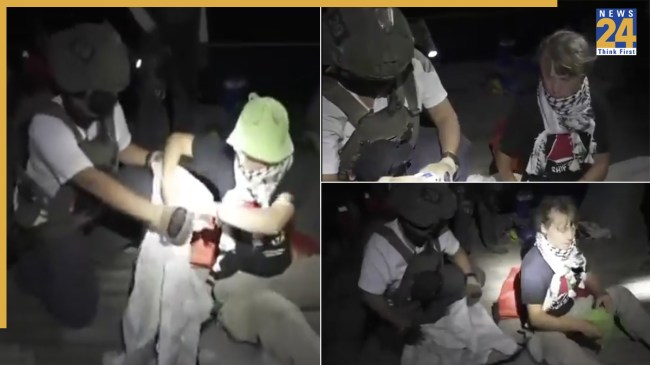 45 जहाजों वाले इसे बेड़े में कई देशों के लोग सवार थे. इजरायली विदेश मंत्री ने अपने एक्स अकाउंट पर एक वीडियो शेयर किया है जिनमें इन नौकाओं को देखा जा सकता है. नौका में सबसे चर्चित शख्स ग्रेटा थनबर्ग हैं, जो डेक पर बैठी थी. उनके साथ 4 सैनिक भी नजर आ रहे हैं. न्यूज एजेंसी रॉयटर्स के मुताबिक, इन बोटों में सवार पाकिस्तानी पूर्व सांसद मुश्ताक के साथ 200 लोगों को गिरफ्तार किया गया है. वीडियो में बाकि लोगों को भी देखा जा रहा है जिनके हाथ ऊपर करवाए गए हैं.