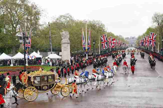 पारंपरिक शाही अंदाज में ताजपोशी के लिए जाता किंग चार्ल्स तृतीय और रानी कैमिला का काफिला।