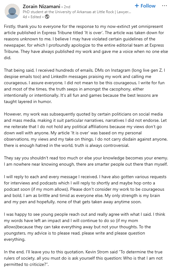 рдкрд╛рдХрд┐рд╕реНрддрд╛рди рдХреЗ рдкреНрд░рдореБрдЦ рдЕрдЦрдмрд╛рд░реЛрдВ рдореЗрдВ рд╕реЗ рдПрдХ, ‘рдж рдПрдХреНрд╕рдкреНрд░реЗрд╕ рдЯреНрд░рд┐рдмреНрдпреВрди’ рдореЗрдВ 1 рдЬрдирд╡рд░реА рдХреЛ рдПрдХ рд▓реЗрдЦ рдЫрдкрд╛ рдерд╛. рдЕрдВрдЧреНрд░реЗрдЬреА рдореЗрдВ рдЫрдкреЗ рдЗрд╕ рд▓реЗрдЦ рдХрд╛ рд╢реАрд░реНрд╖рдХ рдерд╛ ‘It Is Over’. рдХреБрдЫ рд╣реА рдШрдВрдЯреЛрдВ рдмрд╛рдж рдпрд╣ рд▓реЗрдЦ рд╡реЗрдмрд╕рд╛рдЗрдЯ рд╕реЗ рдЧрд╛рдпрдм рд╣реЛ рдЧрдпрд╛. рд▓реЗрдХрд┐рди рдЗрдВрдЯрд░рдиреЗрдЯ рдХреА рджреБрдирд┐рдпрд╛ рдореЗрдВ рдЗрд╕рд╕реЗ рднреВрдЪрд╛рд▓ рдЖ рдЧрдпрд╛. рдЕрдореЗрд░рд┐рдХрд╛ рдореЗрдВ рдкреЭ рд░рд╣реЗ рдПрдХ рдпреБрд╡рд╛ рдкрд╛рдХрд┐рд╕реНрддрд╛рдиреА рдЫрд╛рддреНрд░ рдЬреЛрд░реИрди рдирд┐рдЬрд╛рдорд╛рдиреА рдиреЗ рдкрд╛рдХрд┐рд╕реНрддрд╛рди рдХреЗ ‘рдЬреЗрди-рдЬреА’ рд╡рд░реНрдЧ рдкрд░ рдпрд╣ рд▓реЗрдЦ рд▓рд┐рдЦрд╛ рдерд╛. рдЗрд╕рдореЗрдВ рдЭреВрдареА рджреЗрд╢рднрдХреНрддрд┐ рдХреЗ рдкрд╛рда рдФрд░ рдкреБрд░рд╛рдиреЗ рдкреЬ рдЪреБрдХреЗ рд╕рд░рдХрд╛рд░реА рдиреИрд░реЗрдЯрд┐рд╡ рдХреЛ рд▓реЗрдХрд░ рдЖрд╡рд╛рдЬ рдЙрдард╛рдИ рдЧрдИ рдереА. рд▓реЗрдЦ рд╣рдЯрдиреЗ рдХреЗ рдмрд╛рдж рдкрд╛рдХрд┐рд╕реНрддрд╛рди рдореЗрдВ рдмрд╛рдВрдЧреНрд▓рд╛рджреЗрд╢ рдФрд░ рдиреЗрдкрд╛рд▓ рдЬреИрд╕реЗ рд╣рд╛рд▓рд╛рдд рд╣реЛрддреЗ рджрд┐рдЦ рд░рд╣реЗ рд╣реИрдВ. рдпреБрд╡рд╛рдУрдВ рдореЗрдВ рдХрд╛рдлреА рдЖрдХреНрд░реЛрд╢ рд╣реИ, рд╕реЛрд╢рд▓ рдореАрдбрд┐рдпрд╛ рдкрд░ рдкрд╛рдХрд┐рд╕реНрддрд╛рдиреА рд╕рд░рдХрд╛рд░ рдХреА рджрдмрд╛рдХрд░ рдЖрд▓реЛрдЪрдирд╛ рдХреА рдЬрд╛ рд░рд╣реА рд╣реИ. рдЙрдиреНрд╣реЛрдВрдиреЗ рд▓реЗрдЦ рдореЗрдВ рд▓рд┐рдЦрд╛ рдерд╛ рдХрд┐ рдХреИрд╕реЗ рдкрд╛рдХрд┐рд╕реНрддрд╛рди рдХреА рдпреБрд╡рд╛ рдкреАрдврд╝реА рд╕рд░рдХрд╛рд░ рдФрд░ рд╕реЗрдирд╛ рдХреЗ рдиреИрд░реЗрдЯрд┐рд╡ рдореЗрдВ рдирд╣реАрдВ рдлрдВрд╕ рд░рд╣реА рд╣реИ. рд▓реЗрдЦ рдХреЗ рдЬрд░рд┐рдП рдпрд╣ рдмрддрд╛рдиреЗ рдХреА рдХреЛрд╢рд┐рд╢ рдХреА рдЧрдИ рд╣реИ рдХрд┐ рдХреИрд╕реЗ рдПрдХ рдмреВрдврд╝рд╛ рд╣реЛрддрд╛ рд╕рддреНрддрд╛ рдврд╛рдВрдЪрд╛ ‘рдЬреЗрди-рдЬреА’ рдХреЗ рд╕рд╛рде рддрд╛рд▓рдореЗрд▓ рдирд╣реАрдВ рдмрд┐рдард╛ рдкрд╛ рд░рд╣рд╛ рд╣реИ.