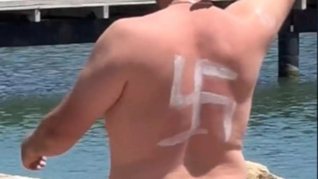 “footage has captured the moment a beachgoer walked around with a Swastika drawn on his back in front of stunned families. The man was spotted with the emblem drawn on his back with sunscreen at Hillarys Boat Harbour, in Perth’s north, on Saturday.”