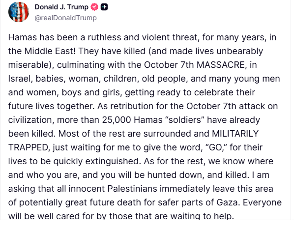 दो साल से चल रहे गाजा युद्ध को खत्म करने के लिए ट्रंप इज़राइल और हमास दोनों पर शांति समझौते पर सहमत होने के लिए दबाव डाल रहे हैं. इसी दवाब के तहत व्हाइट हाउस की ओर से बनाए गए 20 सूत्रीय गाजा प्लान में युद्ध रोकने के अलावा क्षेत्र के भावी प्रशासन को आकार देने का रोडमैप बताया गया है. ट्रंप ने ट्रुथ सोशल पर लिखा कि हम मिडिल ईस्ट में किसी न किसी तरह शांति स्थापित करेंगे. हिंसा और खून खराबा नहीं होने देंगे. मृतकों के शवों सहित बंधकों को हमास को छोड़ना ही होगा. वाशिंगटन डीसी के रविवार शाम 6 बजे तक किसी भी हालत में समझौता हो जाना चाहिए. अगर सभी देश इस पर हस्ताक्षर कर चुके हैं!