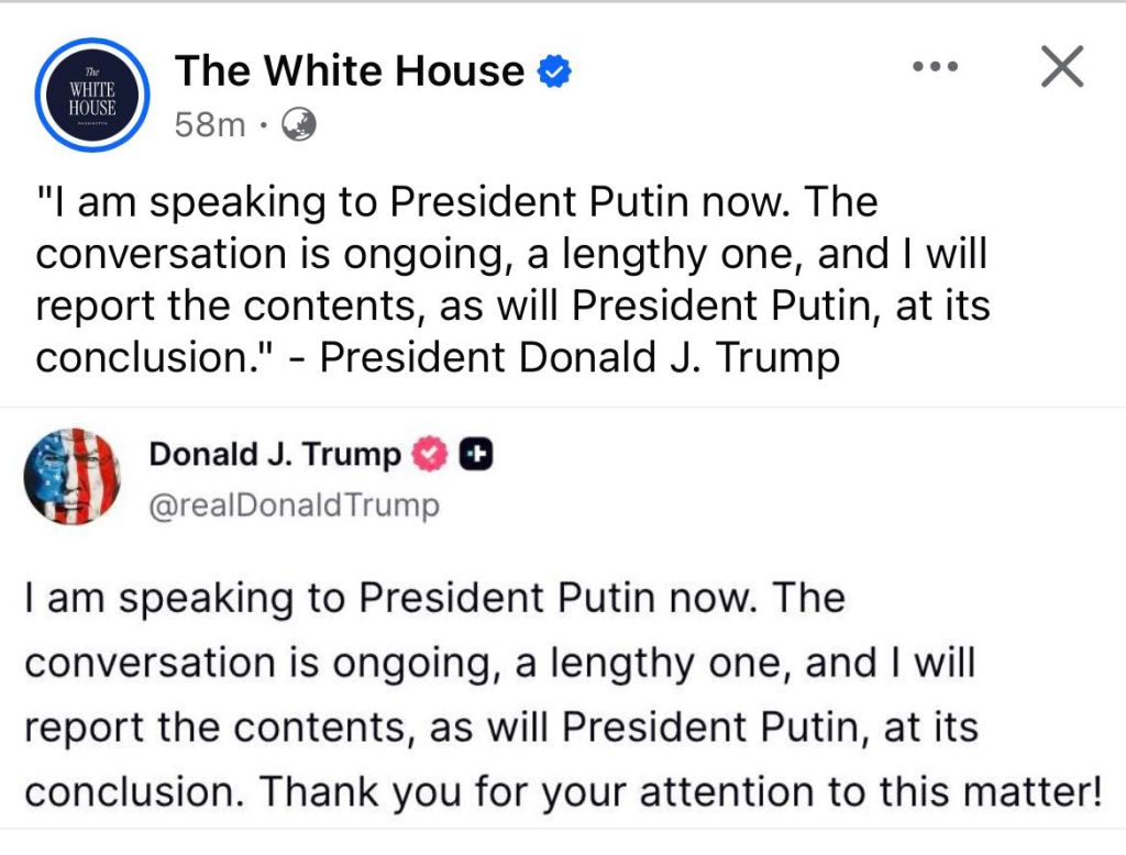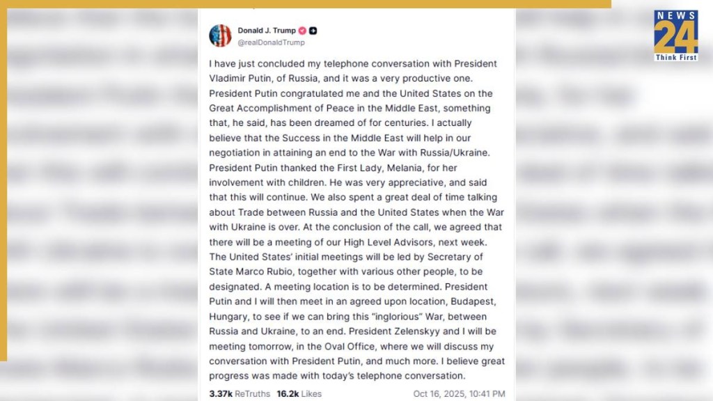 चर्चा के दौरान ट्रंप ने अपने ट्रुथ सोशल प्लेटफॉर्म पर पोस्ट करते हुए कहा कि “बातचीत जारी है, लंबी है, और मैं और राष्ट्रपति पुतिन बातचीत के अंत में इसकी विषय-वस्तु की जानकारी देंगे.” वहीं