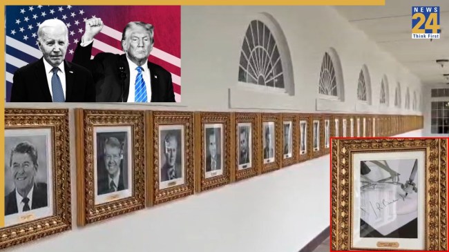 जो बाइडेन अमेरिका के 46 राष्ट्रपति बने थे। प्रेसीडेंशियल वॉक फ्रेम में सभी राष्ट्रपति की क्रम से फोटो लगी है। 45वीं फोटो राष्ट्रपति ट्रंप और 46वें राष्ट्रपति पर जो बाइडेन की फोटो की जगह ऑटो पेन से हस्ताक्षर करती तस्वीर लगाई है। इसके बाद भी 47वें राष्ट्रपति के रूप में ट्रंप की फोटो लगी है।