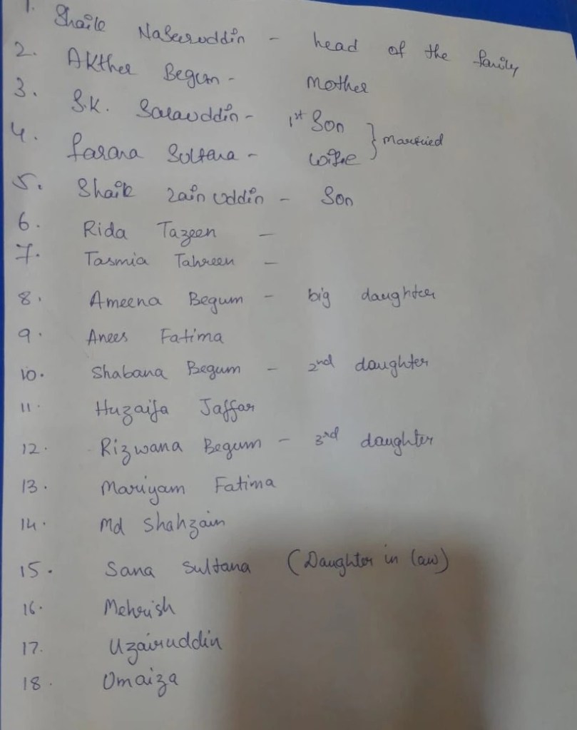 हैदराबाद के विद्यानगर निवासी रिटायर्ड रेलवे कर्मचारी शेख नजीरुद्दीन के परिवार के 18 सदस्यों ने भी हादसे में जान गंवाई. इनमें शेख नजीरुद्दीन (70), अख्तर बेगम उम्र 62 वर्ष नजीरुद्दीन की पत्नी, सलाउद्दीन उम्र 42 वर्ष नजीरुद्दीन का बेटा, अमीना उम्र 44 वर्ष नजीरुद्दीन की बेटी, रिजवाना उम्र 38 वर्ष नजीरुद्दीन की बेटी, शबाना उम्र 40 वर्ष नजीरुद्दीन की बेटी और 9 बच्चे जिनकी उम्र 5 से 15 साल थी और वे शेख के नाती-पोते थे, बेटे सलाउद्दीन और बेटियों के बच्चे थे.
